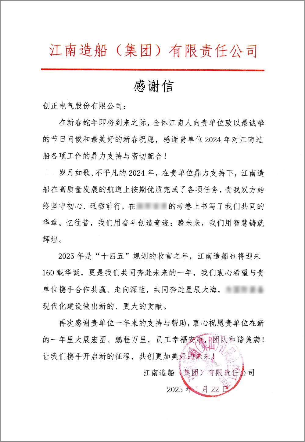 这封感谢信不仅是对创正电气过去工作的高度认可,更是对公司在海工领域综合实力的有力见证。作为中国船舶工业的标杆企业,江南造船厂此次对创正电气的肯定,不仅源于对创正产品的信赖,更彰显了对 “中国智造” 实力的坚定信心。这份荣誉背后,凝聚着创正团队的专业坚守,对品质的执着追求,同时也离不开客户伙伴始终如一的鼎力支持。